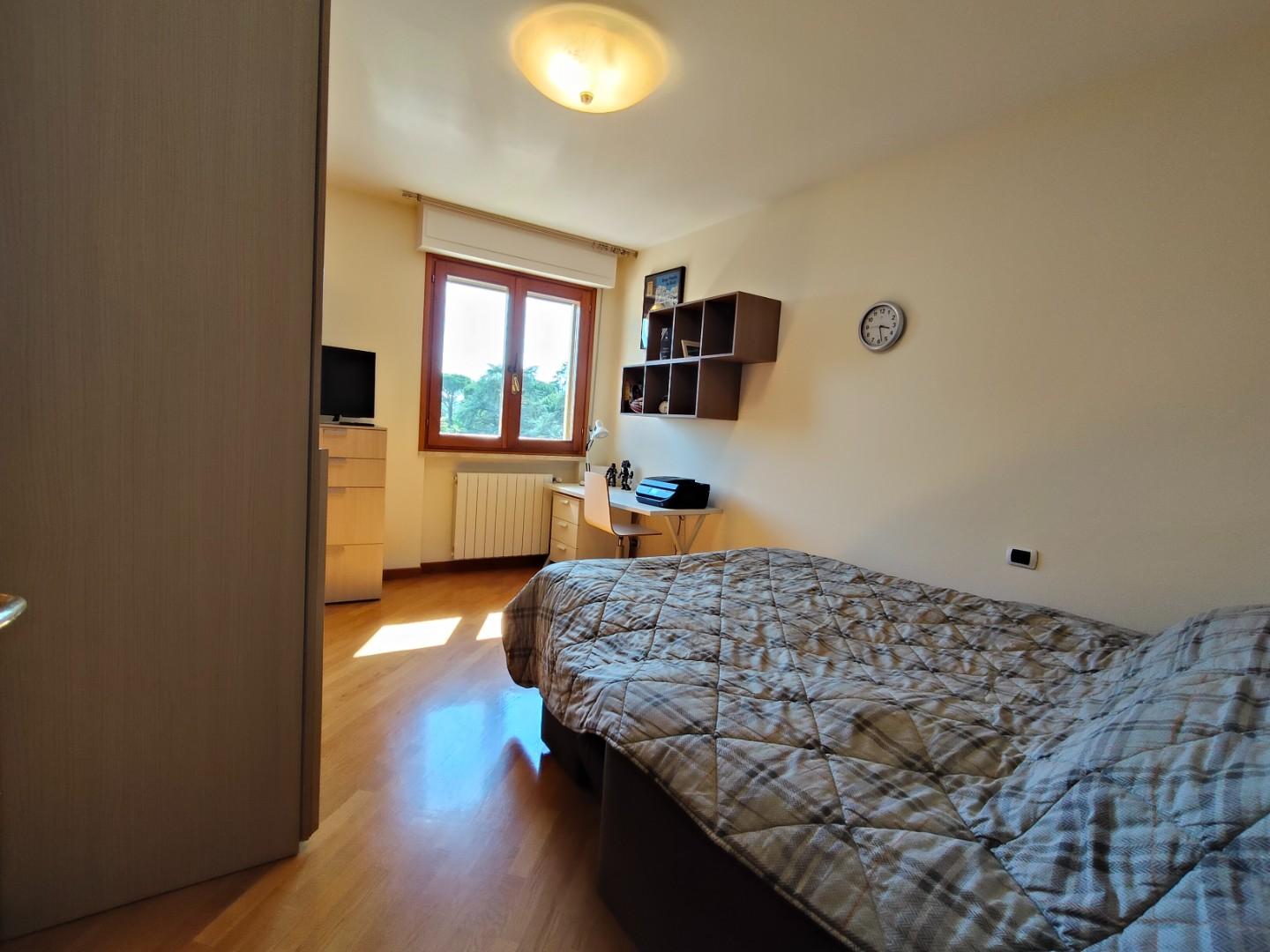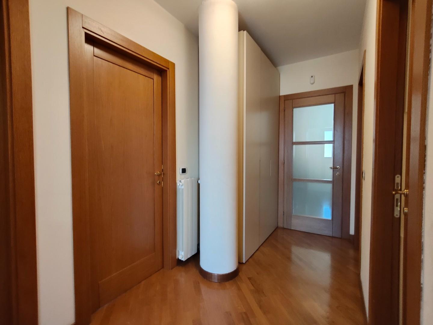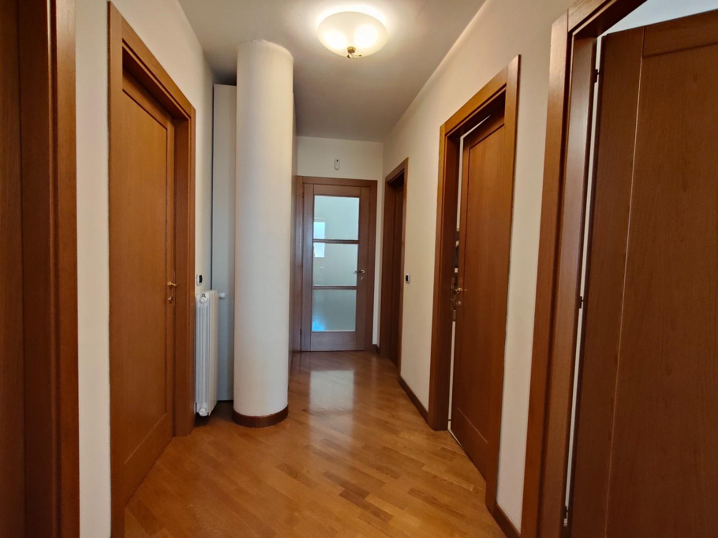 La zona notte è composta da tre camere da letto spaziose, tutte dotate di parquet, e due bagni moderni. Un ripostiglio con accesso a una veranda/lavanderia completa la disposizione interna, rendendo questo attico non solo elegante ma anche funzionale.
